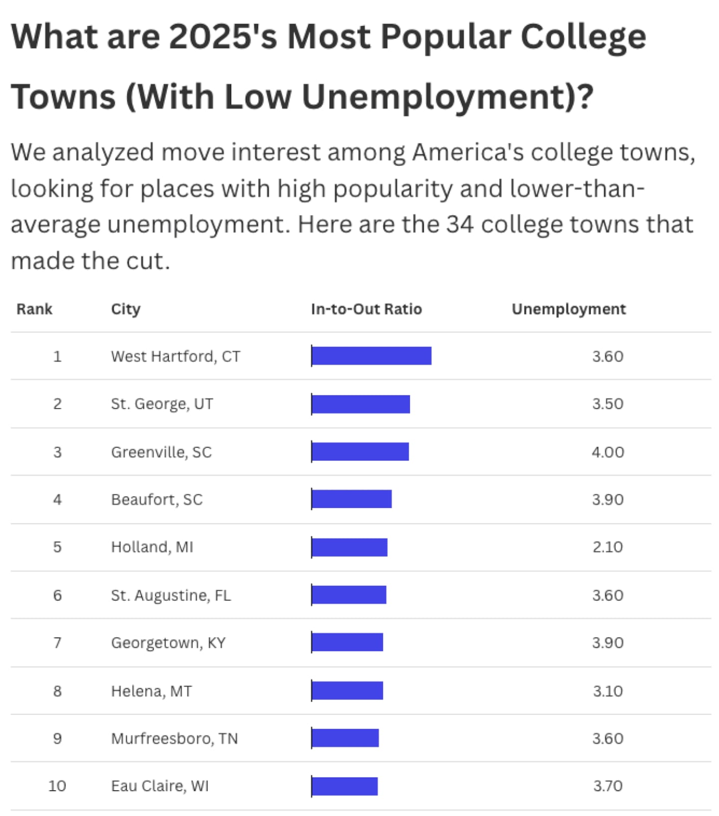 - Of the 34 college towns with a favorable in-move ratio and lower-than-average unemployment, West Hartford, Connecticut, is the most popular, with a 21% higher move ratio than No. 2 St. George, Utah.