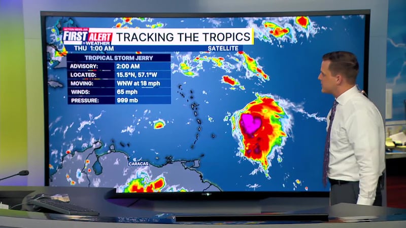 - (1) Tropical storm Jerry is over the Central Atlantic & will be just north/northeast of the Caribbean islands by early Fri. while veering more northward. Jerry stays far to the east of the U.S.
