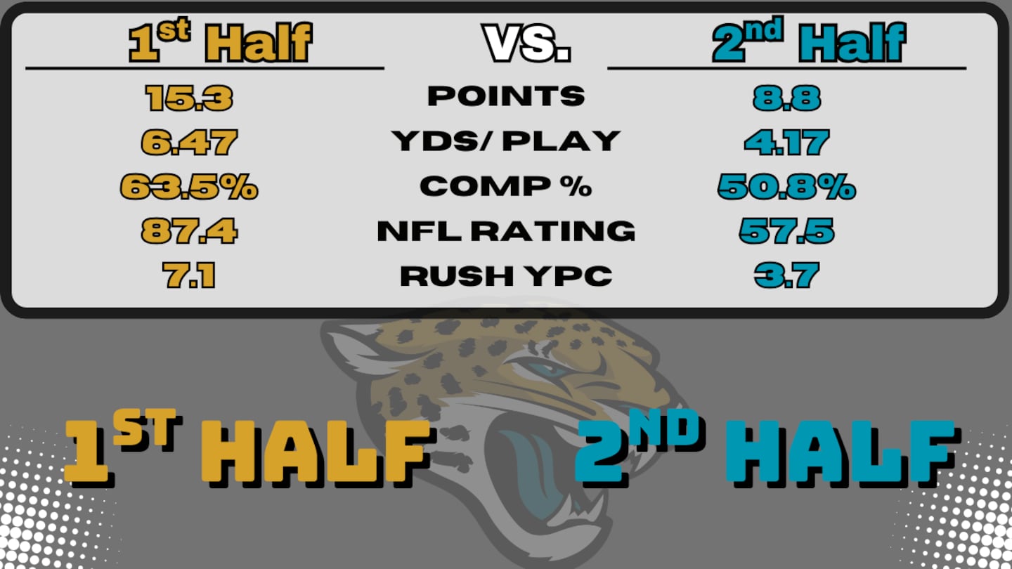 Playing conservatively with a lead is no doubt a factor to be considered, but the Jaguars’ offense has been down right abysmal in second halves. The team is averaging just 4.17 yards per play, compared to that of 6.47 yards in the first.