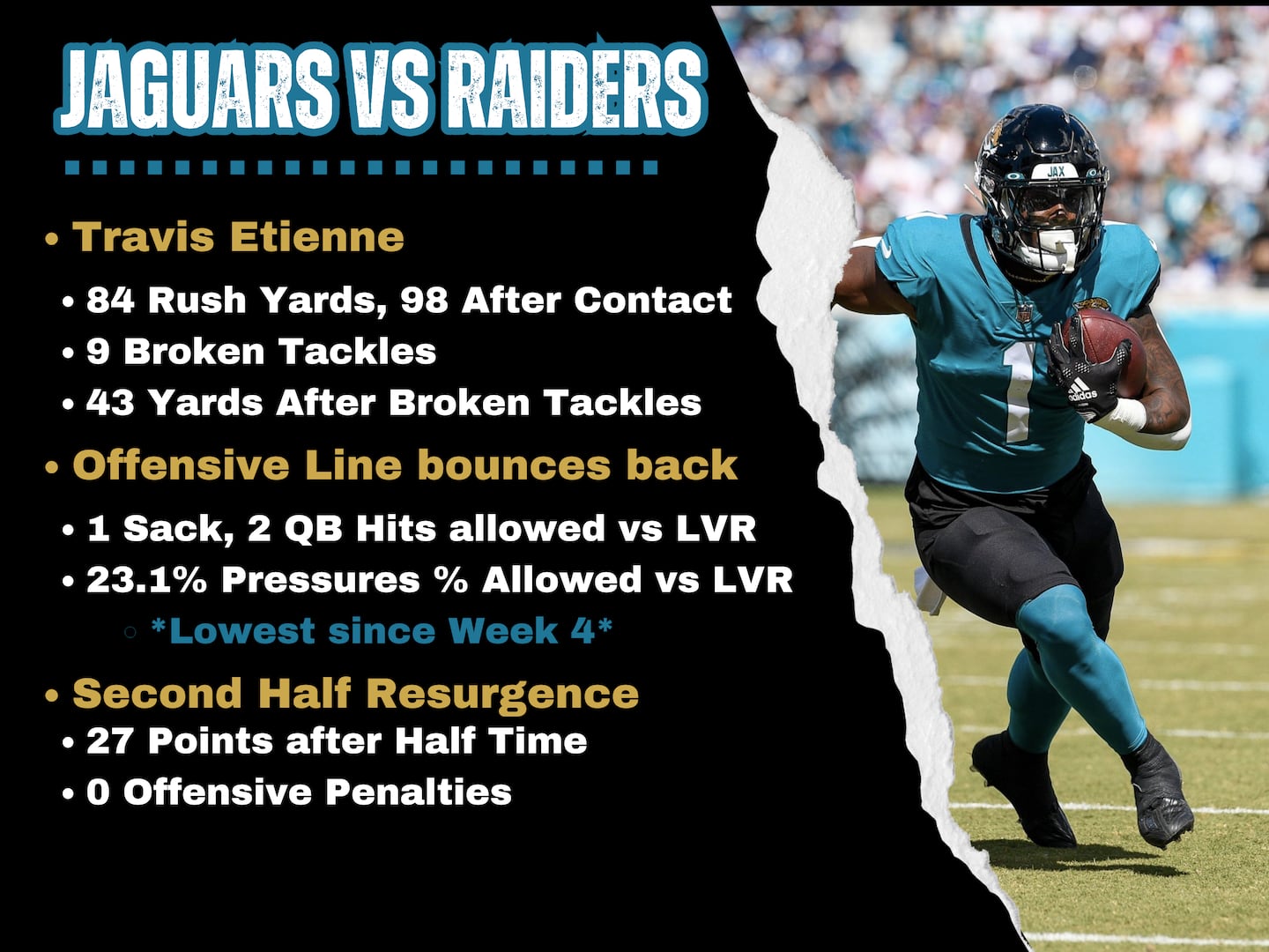 Etienne’s nine missed tackles forced and the 43 yards that came after were both season-highs for the running back. The Jaguars finished the game with eight straight runs, capping off a 10-play, 44-yard drive in overtime.