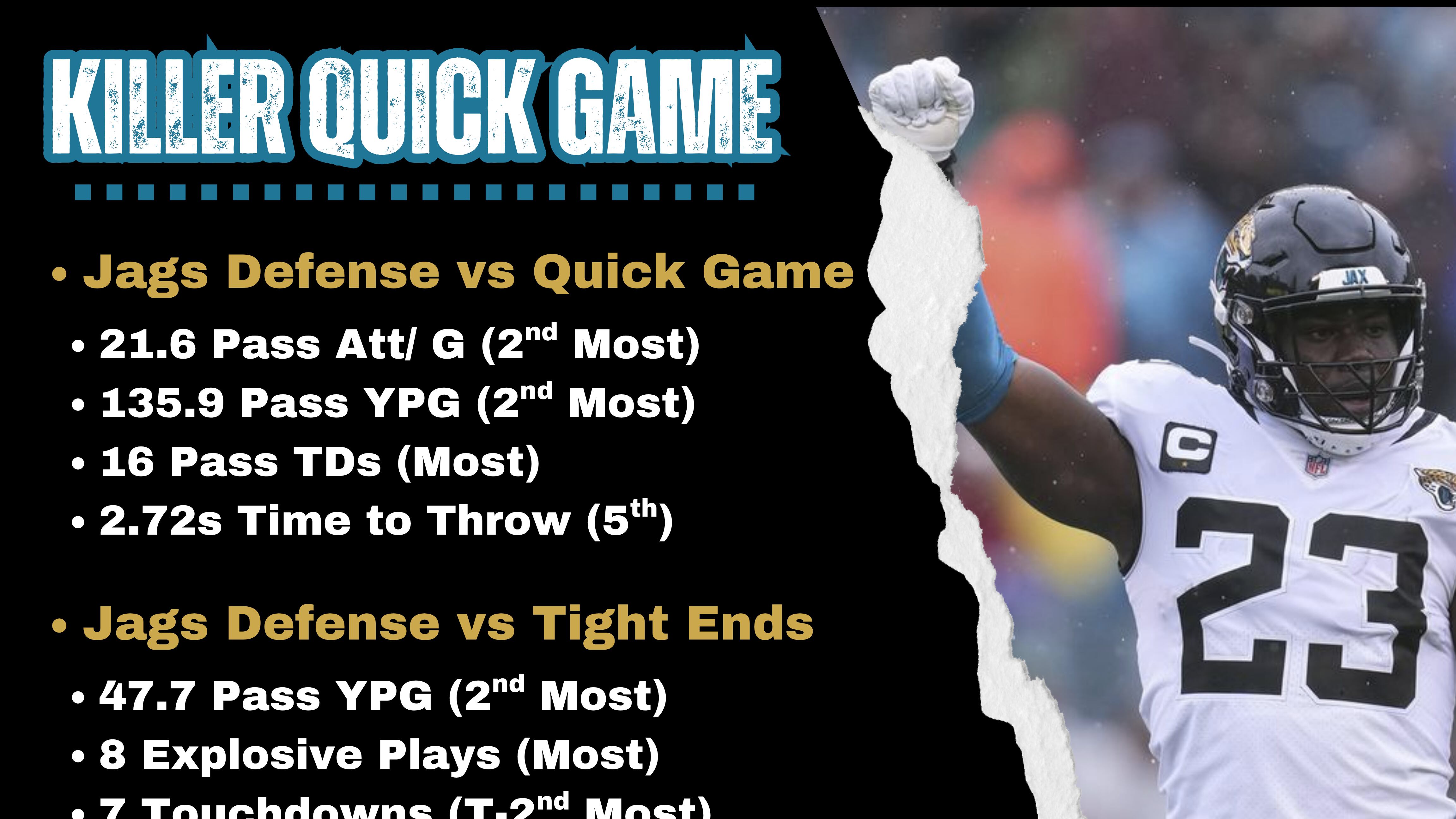Through nine games, the Jaguars have been used and abused in the quick game. The unit is facing the second most quick passes per game (21.6) and, unsurprisingly, allowing the second most yards (135.9) in the NFL.