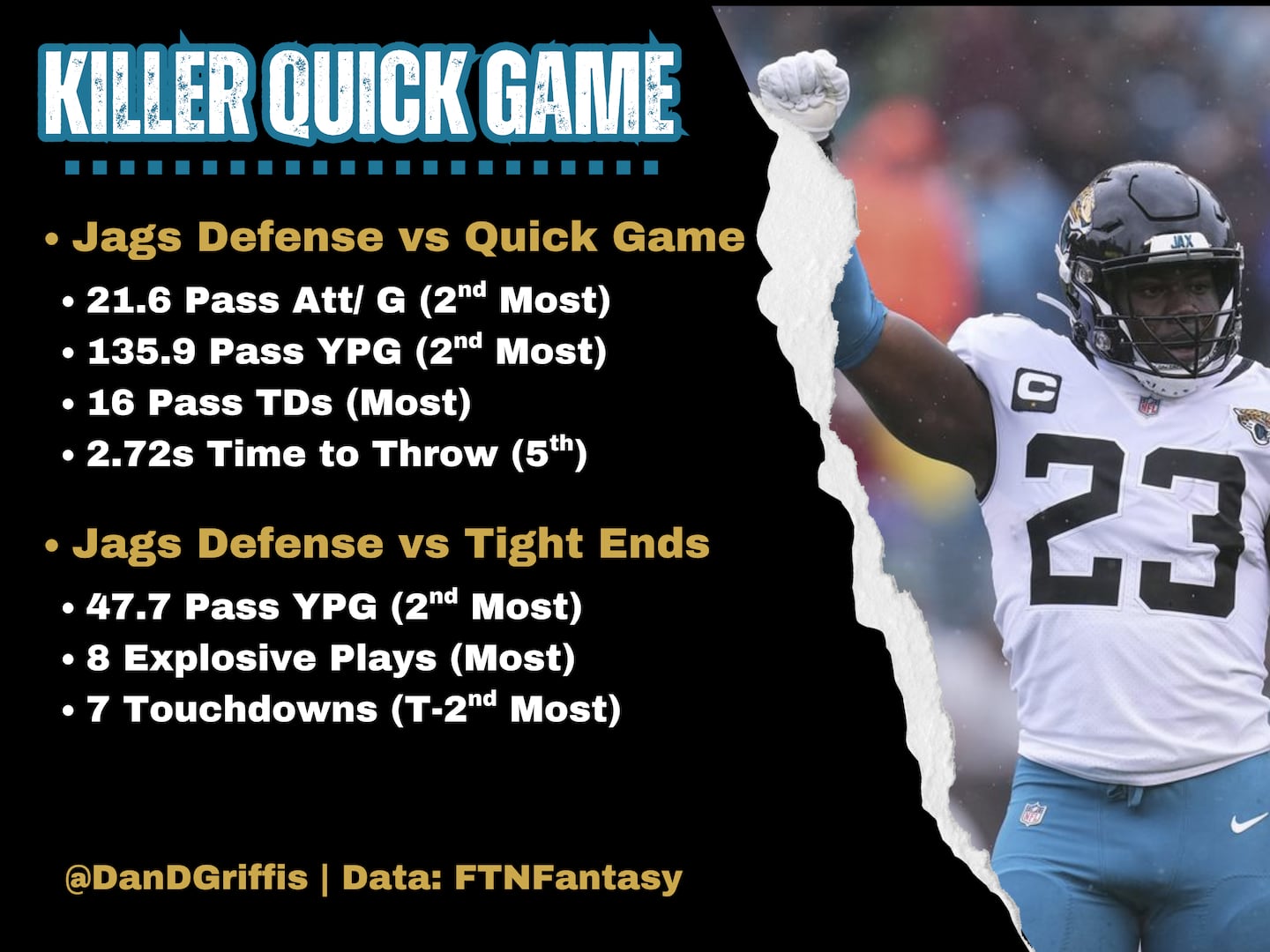 The quick passes have been especially costly inside the red zone. According to FTN Fantasy, 16 of the touchdowns the Jaguars have allowed this season have been quick passes, most in the NFL.