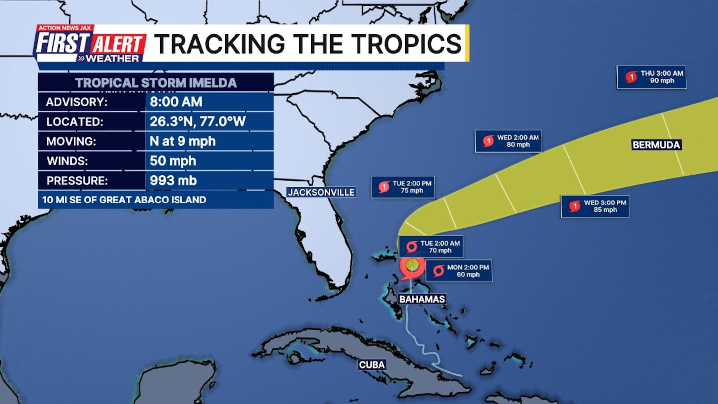 JACKSONVILLE, Fla. — As of 5 PM, Tropical Storm Imelda is now forecast to become a hurricane Tuesday morning — Bermuda is now under a hurricane watch.