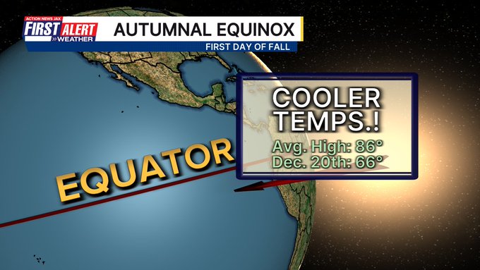 The autumnal equinox arrives Mon., Sept. 22nd. That’s when the sun’s rays are most directly over the equator. Cooler temps., shorter days & less rain as we get deeper into fall.