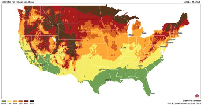 Fall colors are rapidly spreading southward & are even past peak at some northern latitudes & mountainous areas. Our local fall foliage isn’t a whole lot, of course, but becomes noticeable by mid to late Nov. & peaks near Christmas. From “Explore Fall”: