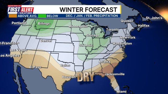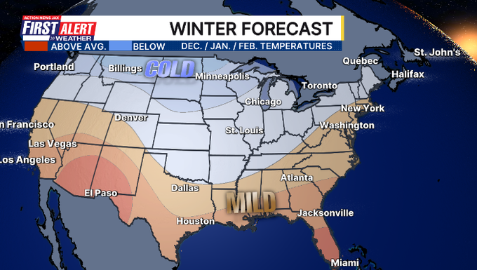 With a La Nina in mind, NOAA has issued their annual outlook for the winter ahead (Dec./Jan./Feb.). Wet (snowy) & colder than avg. across parts of the north & Ohio Valley... dry & milder across the south - including Jax/NE Fl./SE Ga.